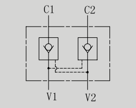 流れは一方向(V1 から C1 または V2 から C2)に通過できますが、逆の両方向(C1 から V1 または C2 から V2)ではバルブは閉じたまま(チェックされます)、シリンダーまたはシリンダーを所定の位置に保持してロックします。他のアクチュエータ。逆流は、交差接続されたパイロット ポートとして機能する V2 または V1 に十分なパイロット圧力が加えられ、パイロット ピストンがシリンダ ポートの圧力に打ち勝ってポペットをシートから持ち上げる場合にのみ可能です。