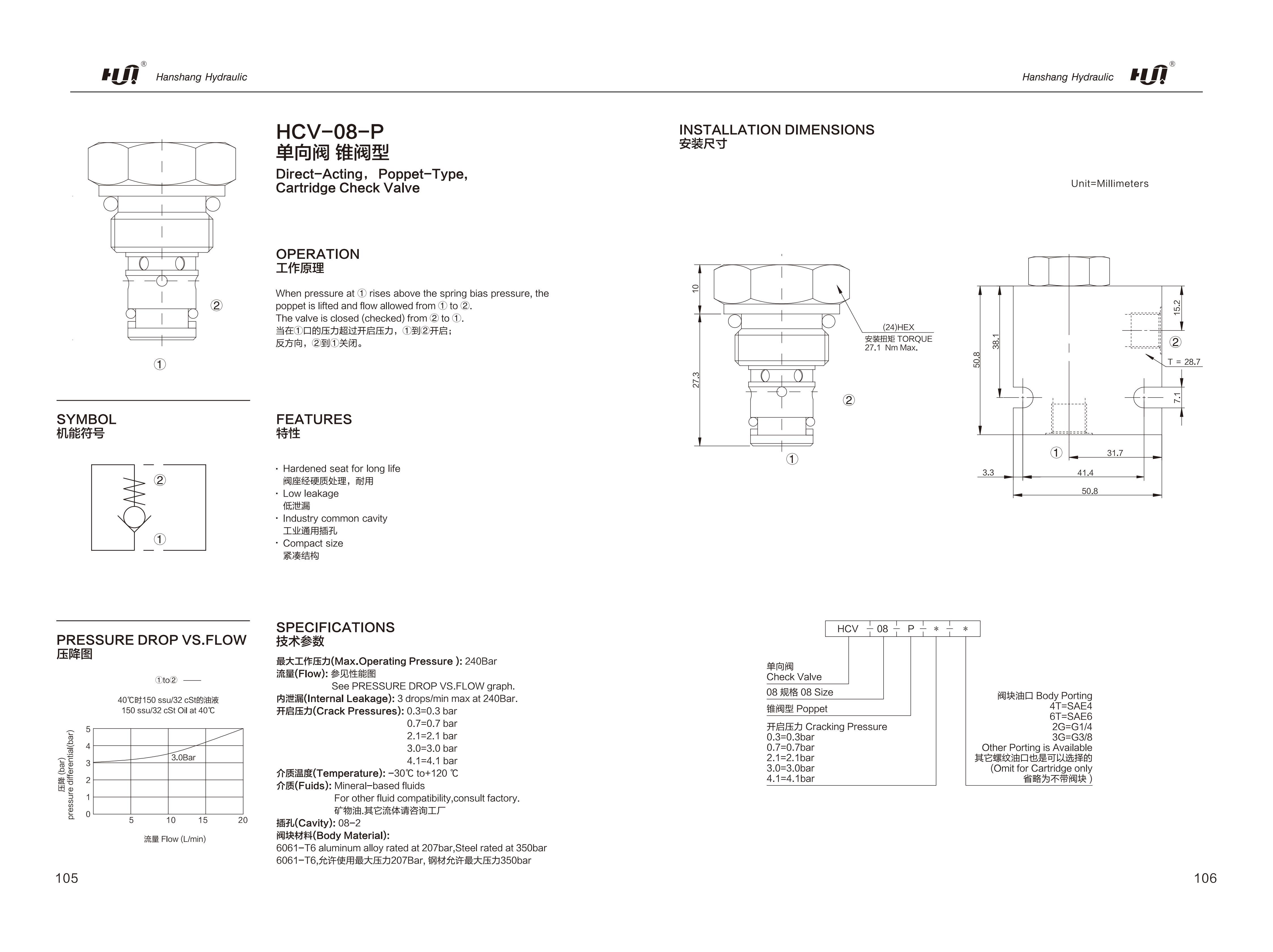 HCV-08-P Direct-Acting, Poppet-Type, Cartridge Check Valve