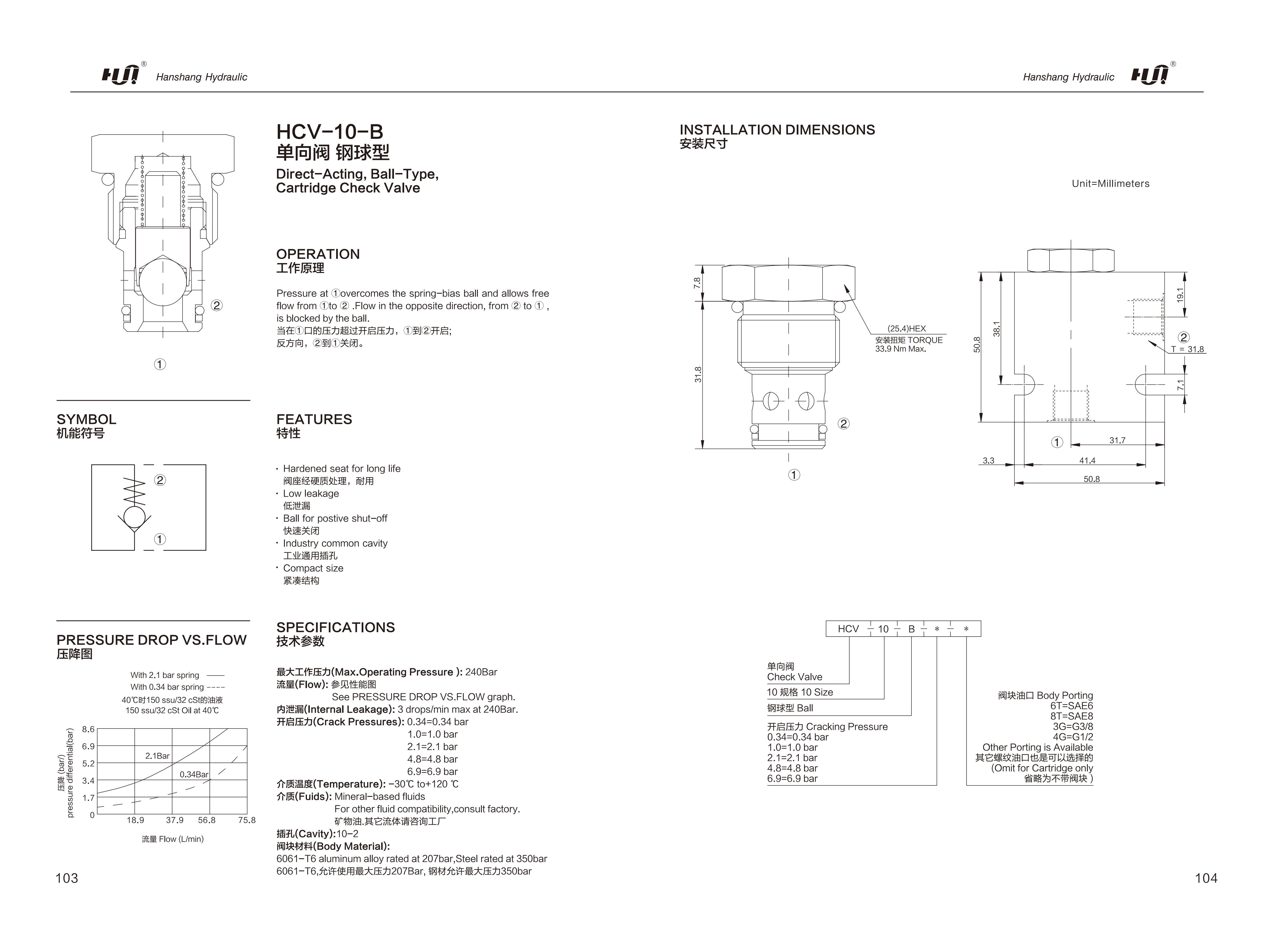HCV-08-B Direct-Acting, Ball-Type, Cartridge Check Valve