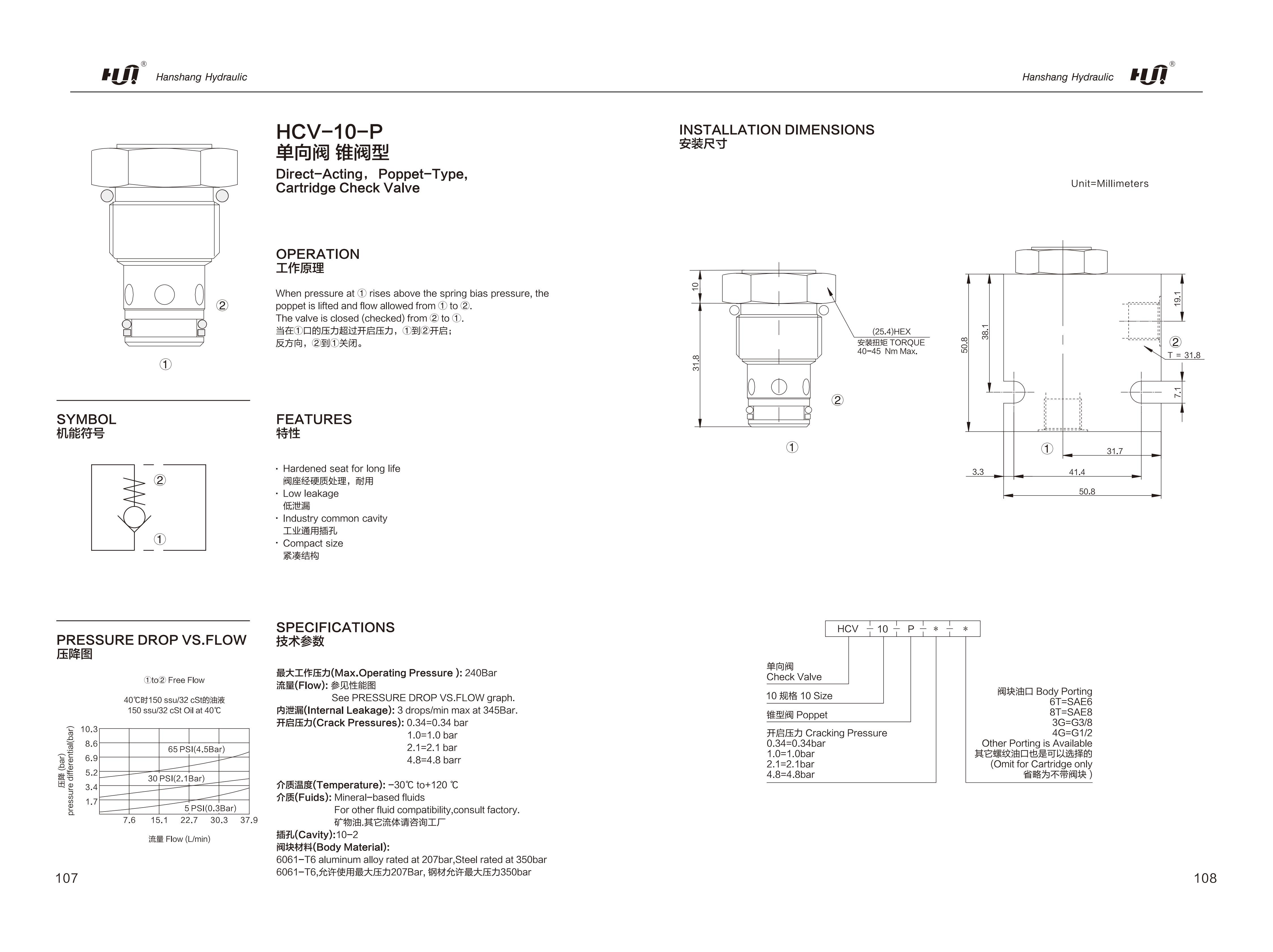 HCV-08-P Direct-Acting, Poppet-Type, Cartridge Check Valve