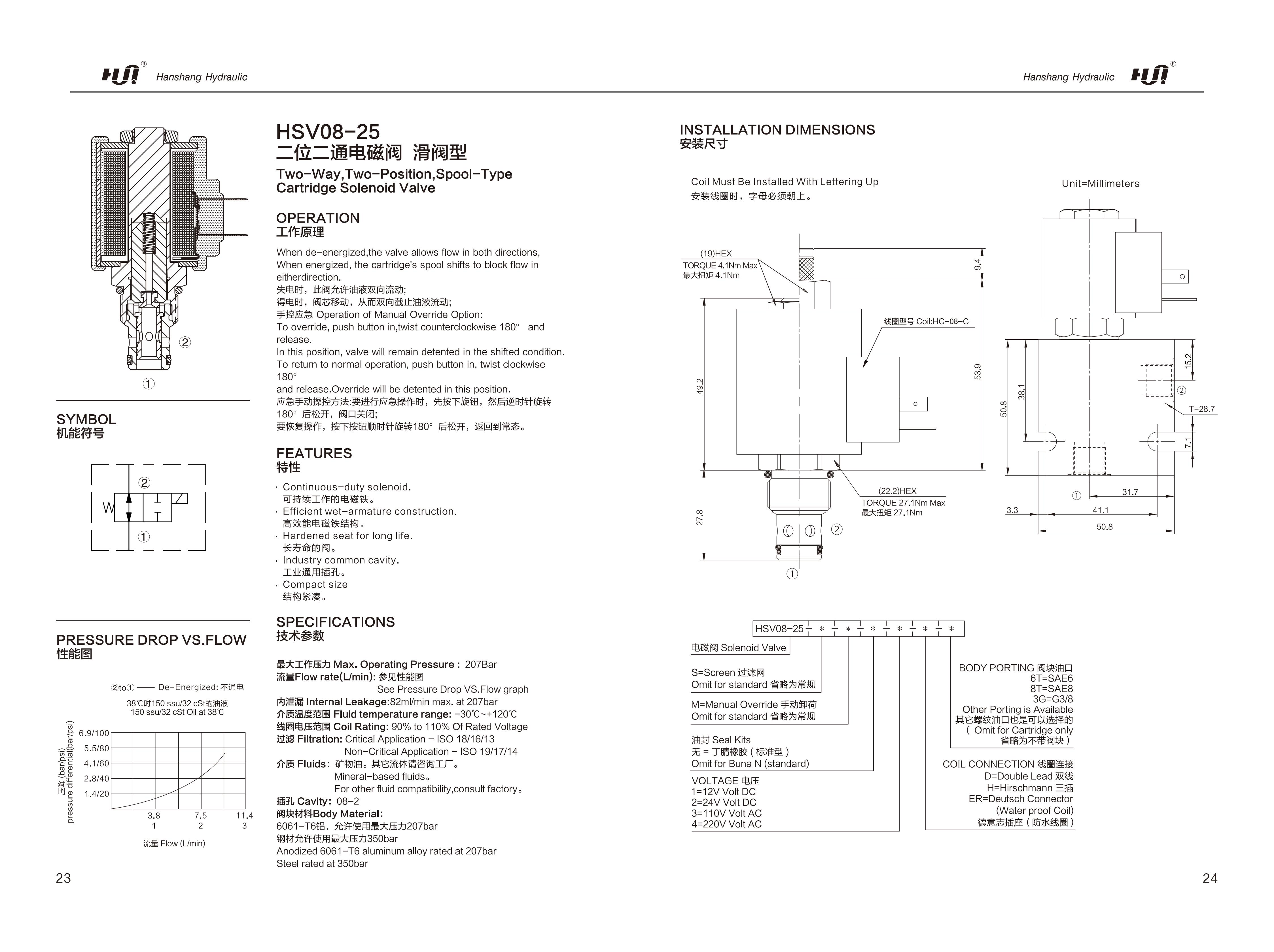 HSV08-25 Two-Way, Two-Position, Spool-Type Cartridge Solenoid Valve