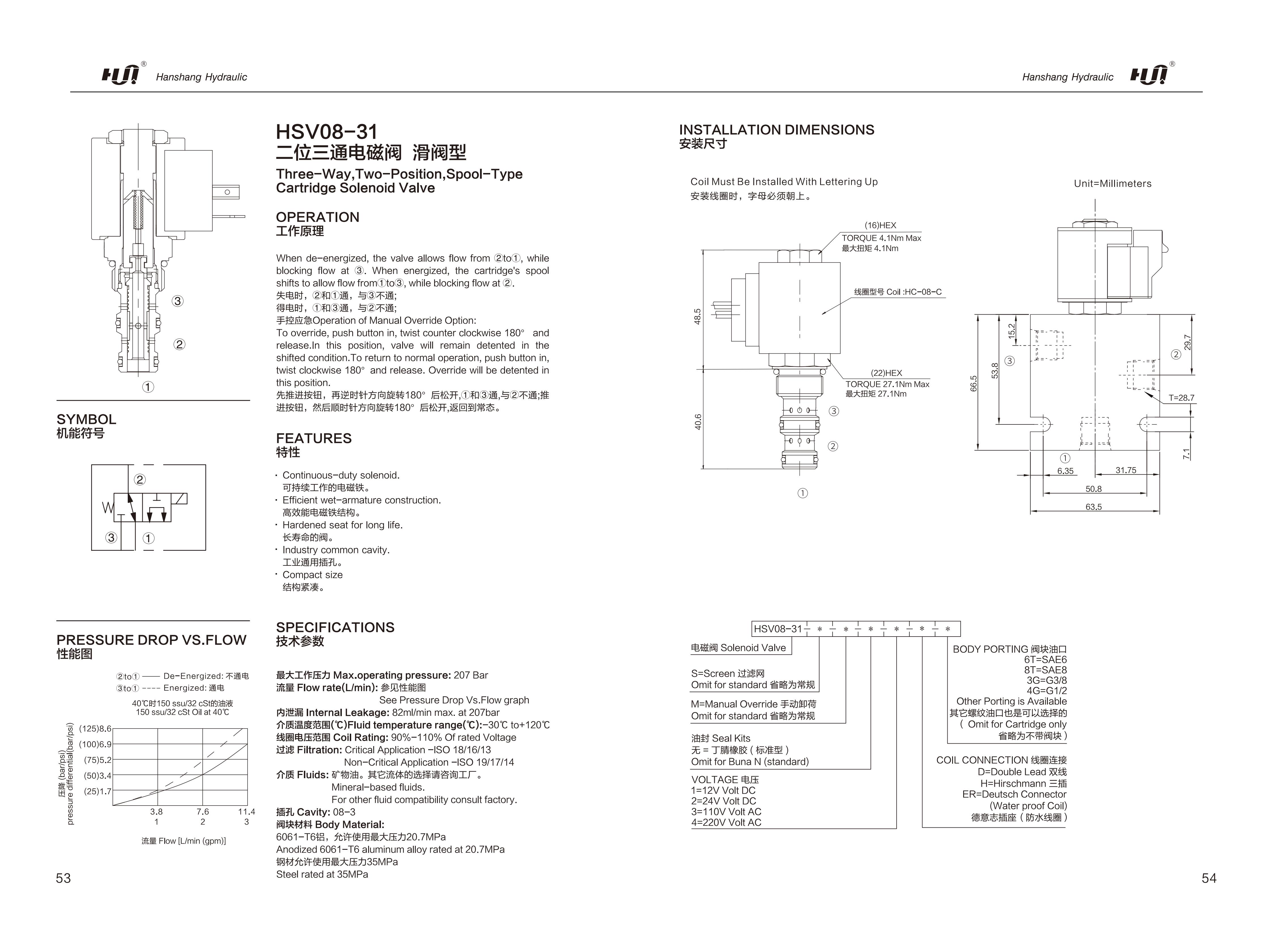HSV08-31 Three-Way, Two-Position, Spool-Type Cartridge Solenoid Valve