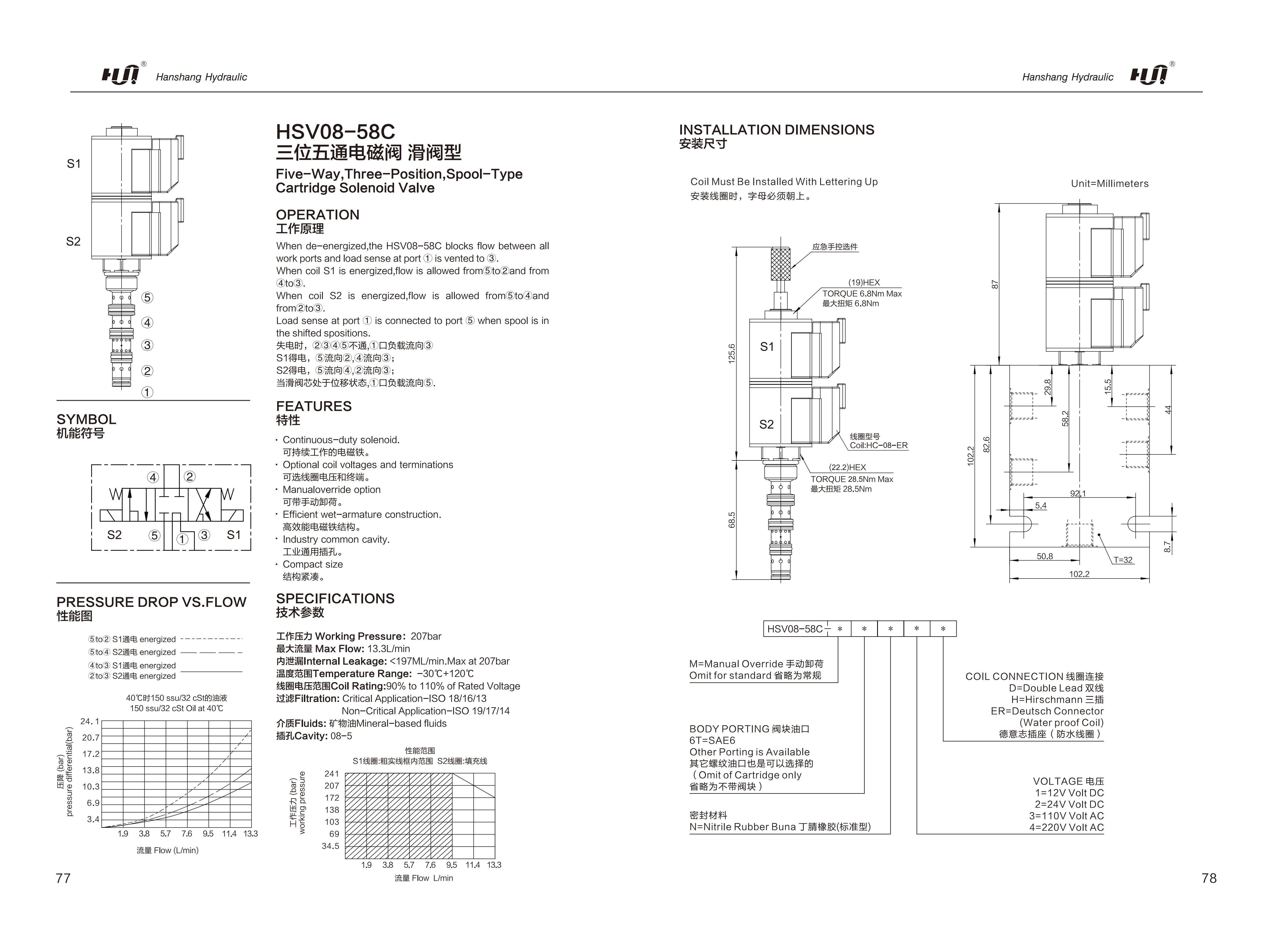 HSV08-58C Five-Way, Three-Position, Spool-Type Cartridge Solenoid Valve