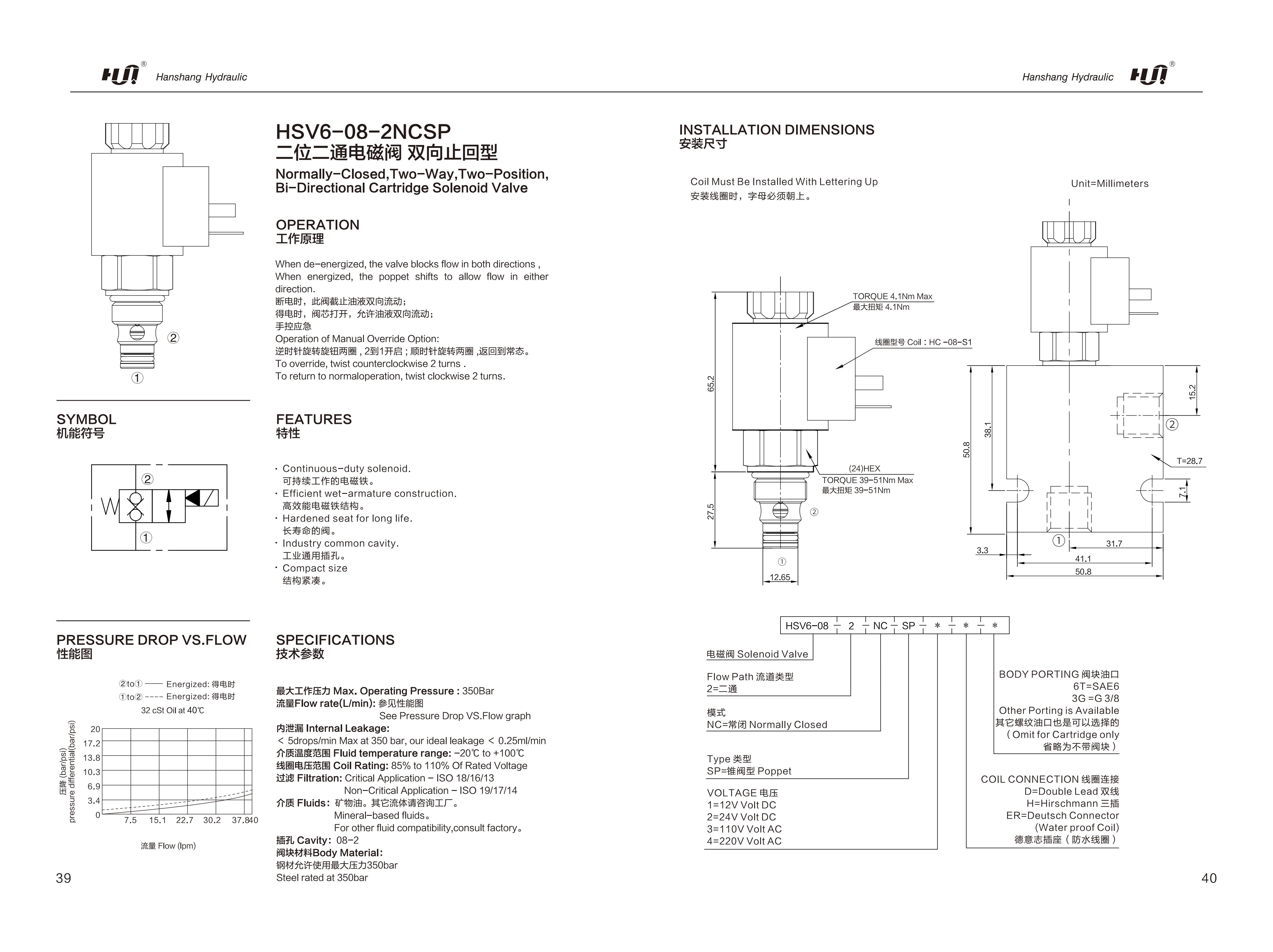 HSV6-08-2NCSP Normally-Closed, Two-Way, Two-Position, Bi-Directional Cartridge Solenoid Valve