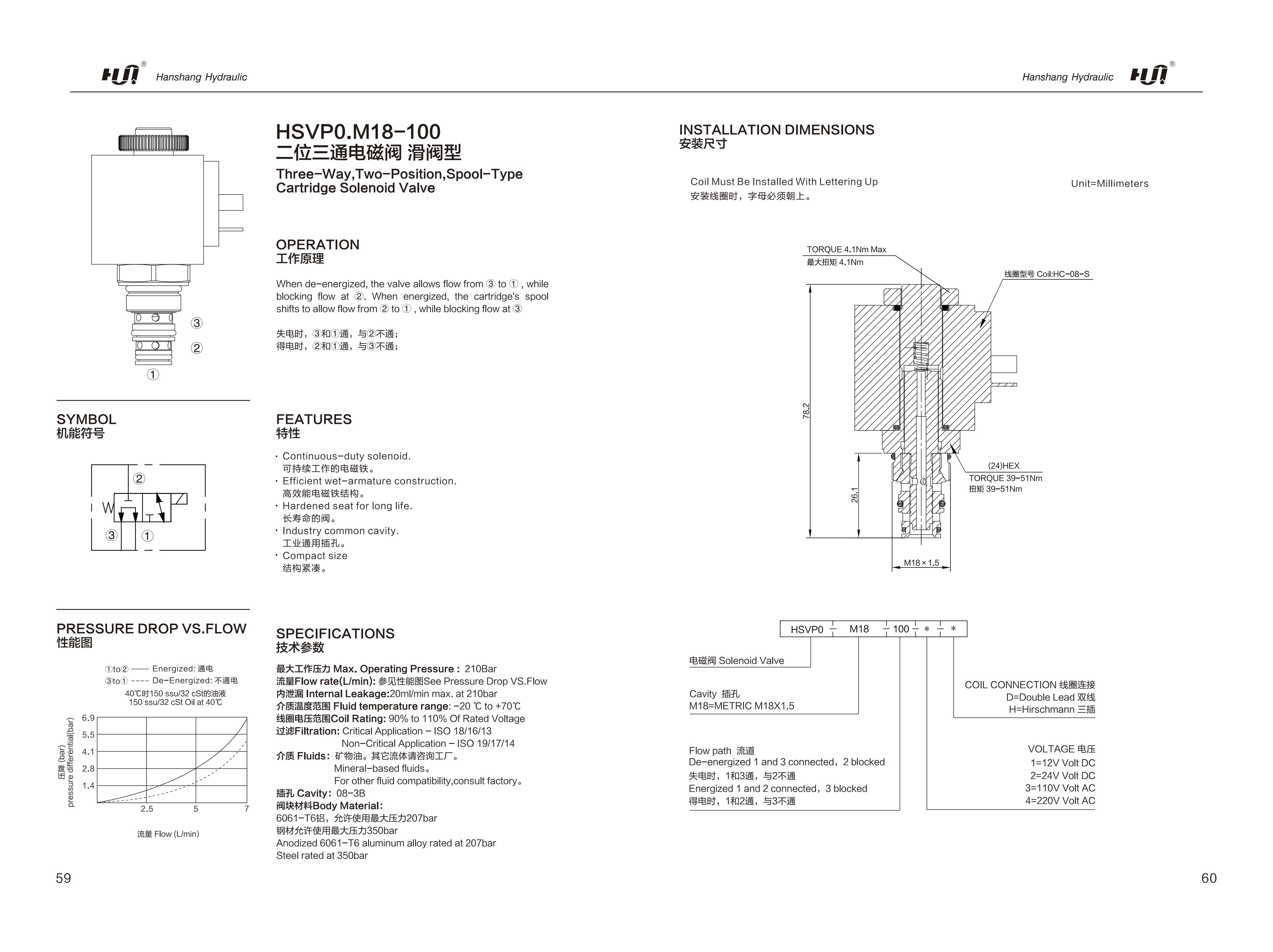 HSVP0.M18-100 Three-Way, Two-Position, Spool-Type Cartridge Solenoid Valve